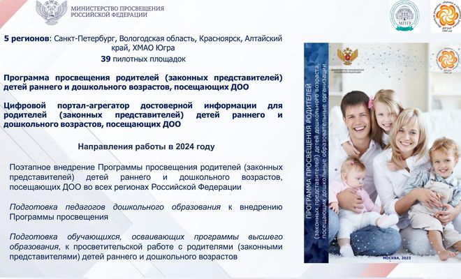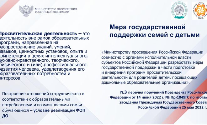 Программа просвещения родителей (законных представителей) детей дошкольного возраста, посещающих дошкольные образовательные организации, представляет собой документ призванный оказать помощь педагогам и другим специалистам дошкольных образовательных организаций в просветительской деятельности. Разработка Программы осуществлялась как мера государственной поддержки в части подготовки и внедрения программ просветительской деятельности для родителей детей, посещающих дошкольные образовательные организации (во исполнение пункта 3 перечня поручений Президента Российской Федерации от 14 июня 2022 г. № Пр-1049ГС по итогам заседания Президиума Государственного Совета Российской Федерации 25 мая 2022 г.).