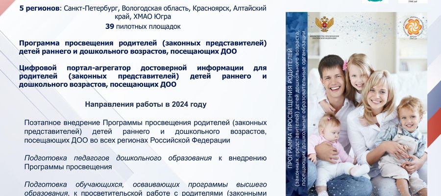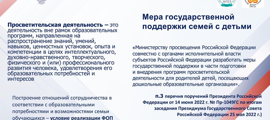 Программа просвещения родителей (законных представителей) детей дошкольного возраста, посещающих дошкольные образовательные организации, представляет собой документ призванный оказать помощь педагогам и другим специалистам дошкольных образовательных организаций в просветительской деятельности. Разработка Программы осуществлялась как мера государственной поддержки в части подготовки и внедрения программ просветительской деятельности для родителей детей, посещающих дошкольные образовательные организации (во исполнение пункта 3 перечня поручений Президента Российской Федерации от 14 июня 2022 г. № Пр-1049ГС по итогам заседания Президиума Государственного Совета Российской Федерации 25 мая 2022 г.).
